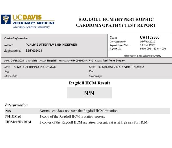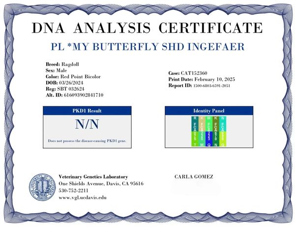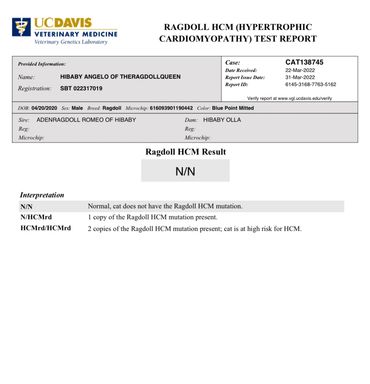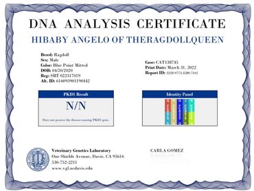 Excellent Pedigree NEGATIVE for both HCM mutations and PKD Feline Leukemia = Negative